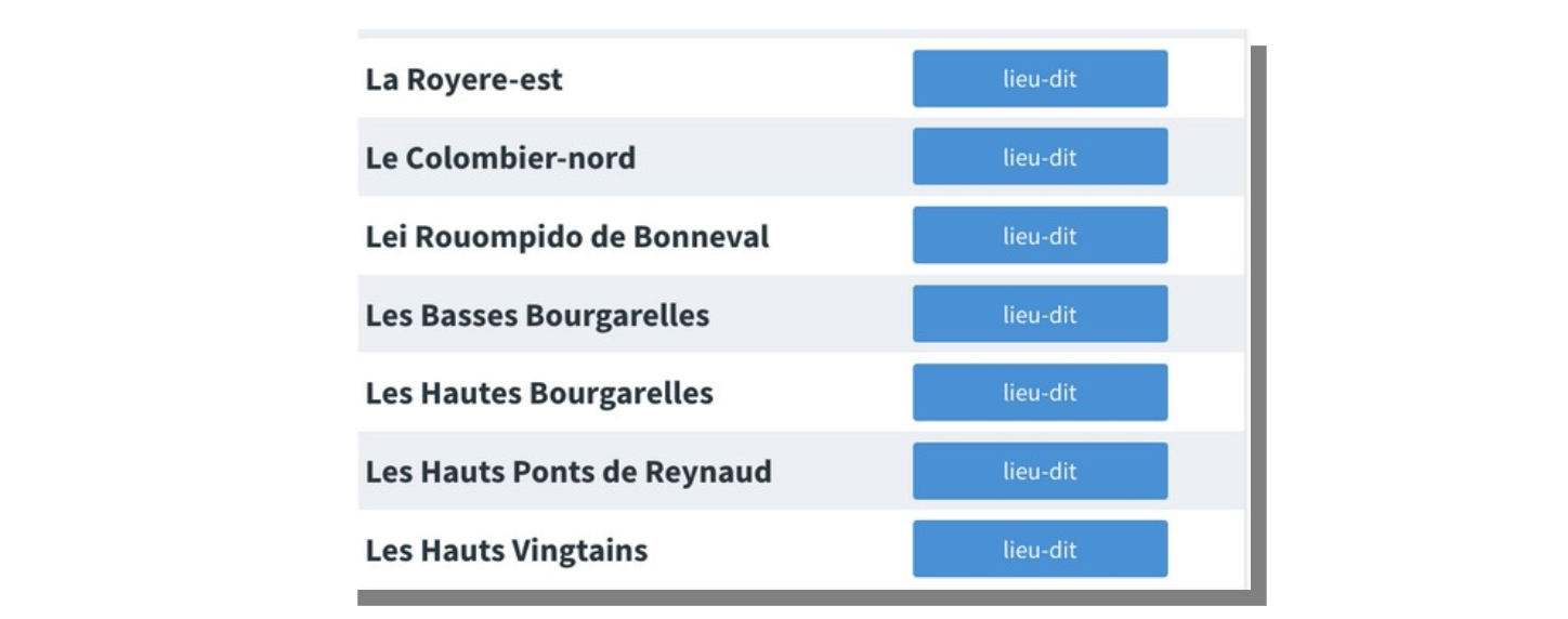 Si la commune n’a pas encore publié de Base Adresse Locale, des lieux-dits issus du fichier FANTOIR sont présents dans la Base Adresse Nationale. Il suffit de se rendre sur https://adresse.data.gouv.fr/ et de renseigner le nom de la commune dans la barre de recherches, puis de sélectionner la liste des lieux-dits. Voici un exemple pour la commune de Charleval (13)