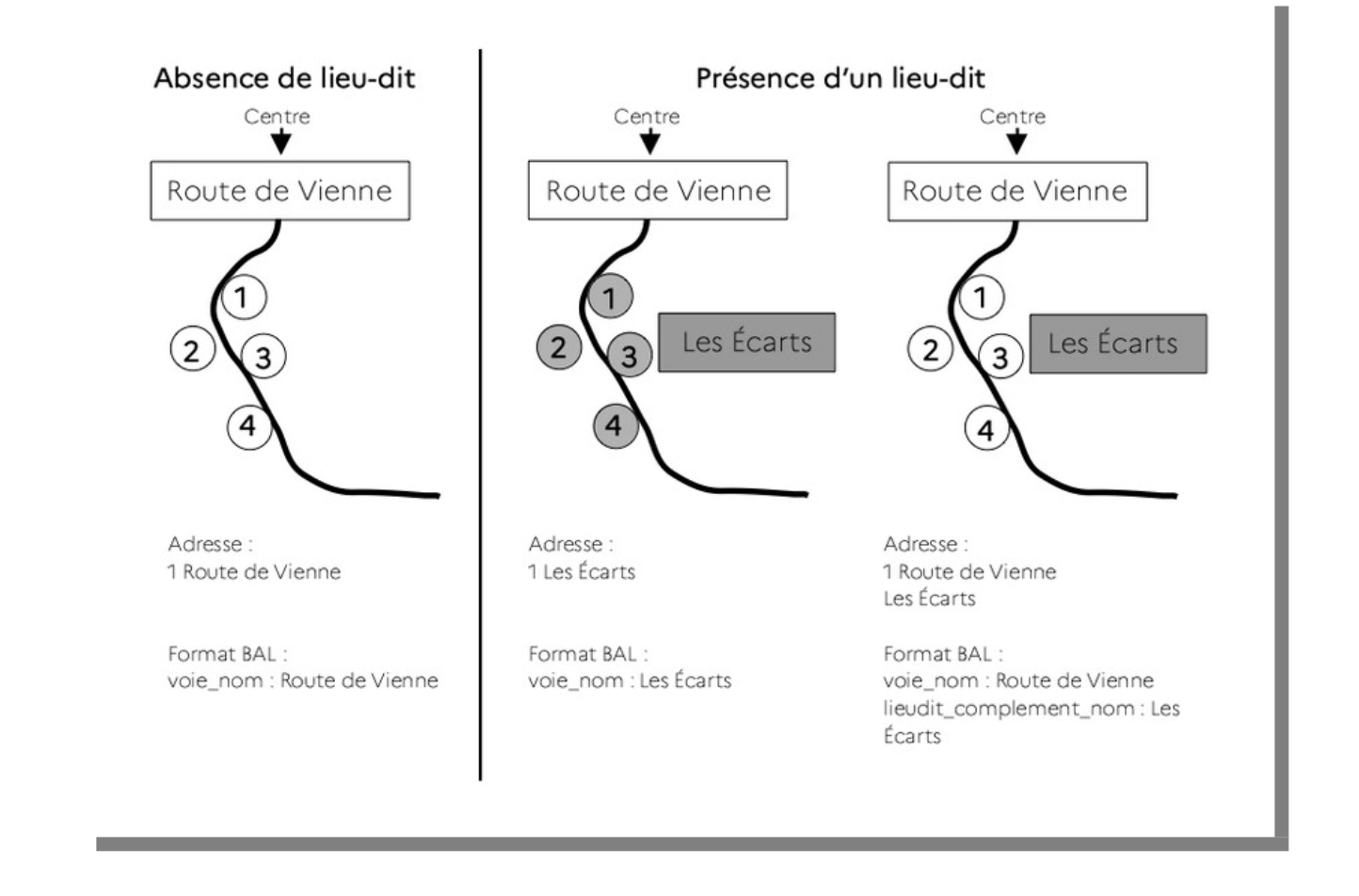 La commune a le choix de placer le nom du lieu-dit dans la liste des voies (voie_nom du format base Adresse Locale) ou dans la liste des lieux-dits (liste des toponymes dans l’éditeur Mes Adresses ou lieu-dit_complement_nom du format Base Adresse Locale). La limite est celle de la cohérences des numéros :