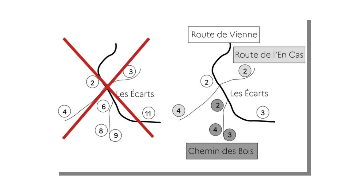 Dans un lieu-dit, si les numéros ne peuvent pas se suivre sur le même tronçon, ils sont affectés à ses voies et non au lieu-dit directement.