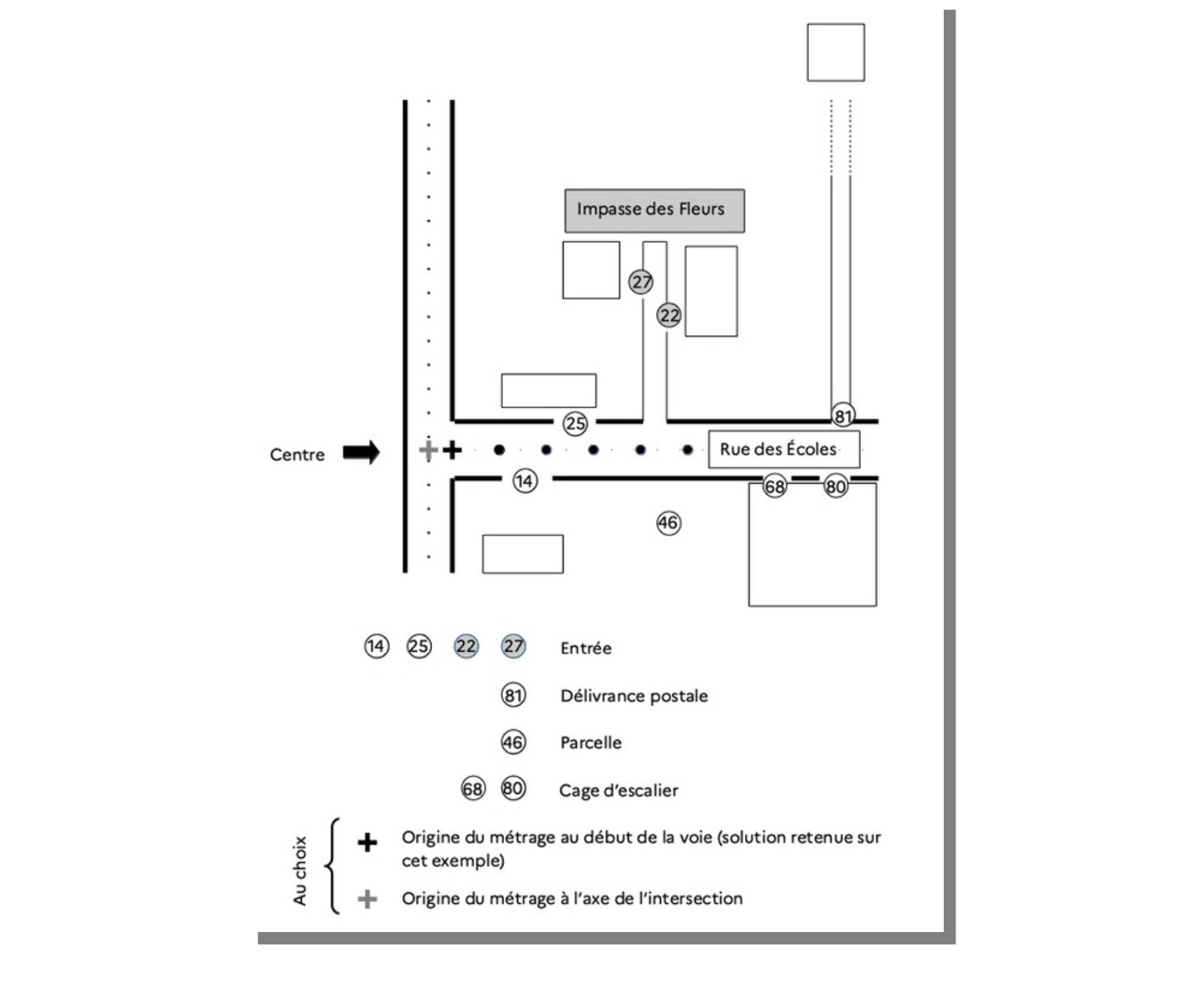 Le numérotage commence au début de la voie ou à l’intersection avec la voie précédente (choisir une formule et s’y tenir pour l’ensemble de la commune) et avance en me- sure métrique ou décamétrique par exemple dans le cas d’adresses espacées afin d’éviter des numéros trop importants. Un bâtiment située à 20 mètres côté droit recevra le numéro 20. Pour le même nombre de mètres, le bâtiment côté gauche portera le numéro impair le plus proche (19 ou 21). Les numéros ne dépassent pas 9999. Si la voie est plus longue, il convient de décaler par exemple d’une unité.