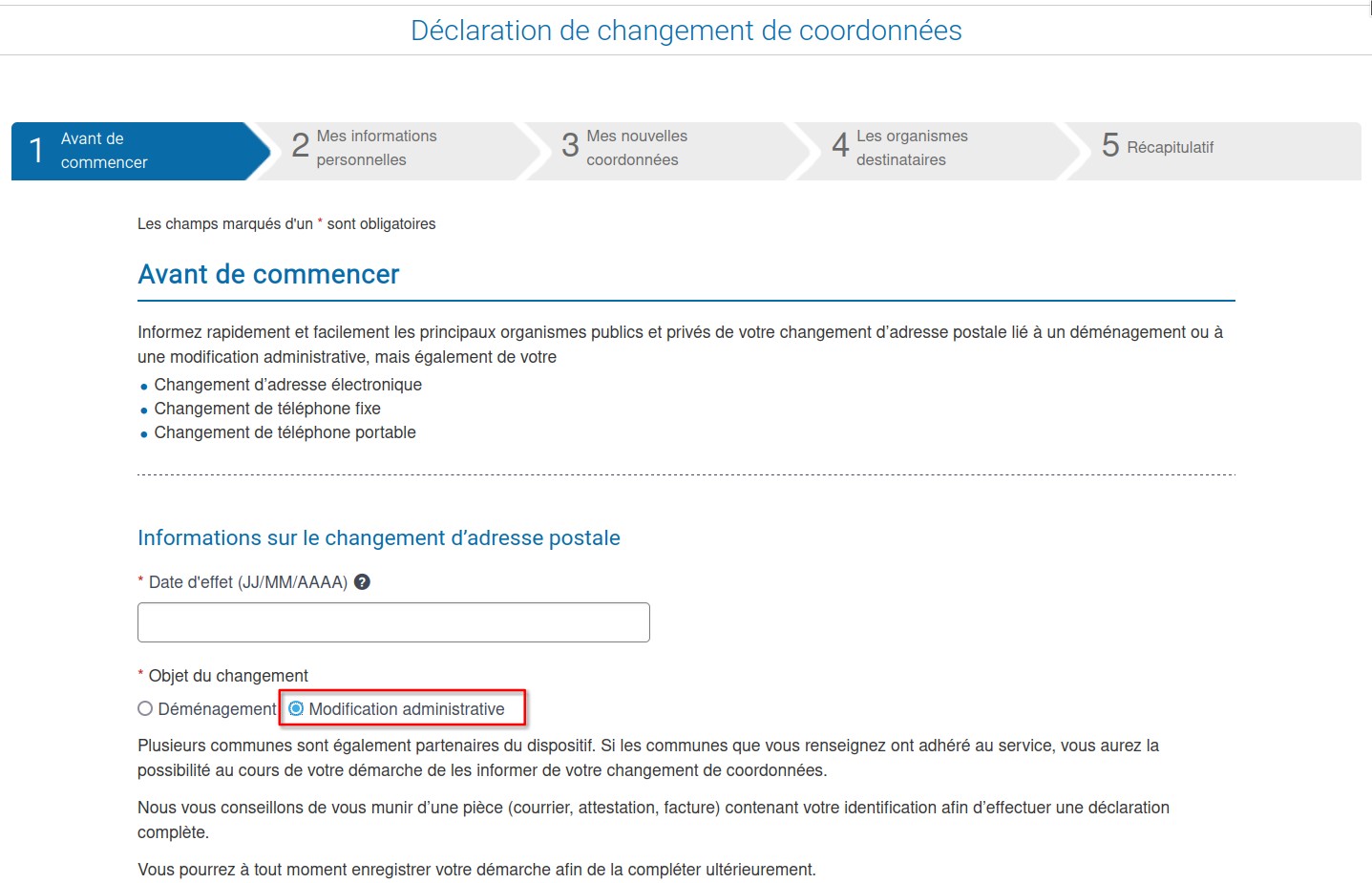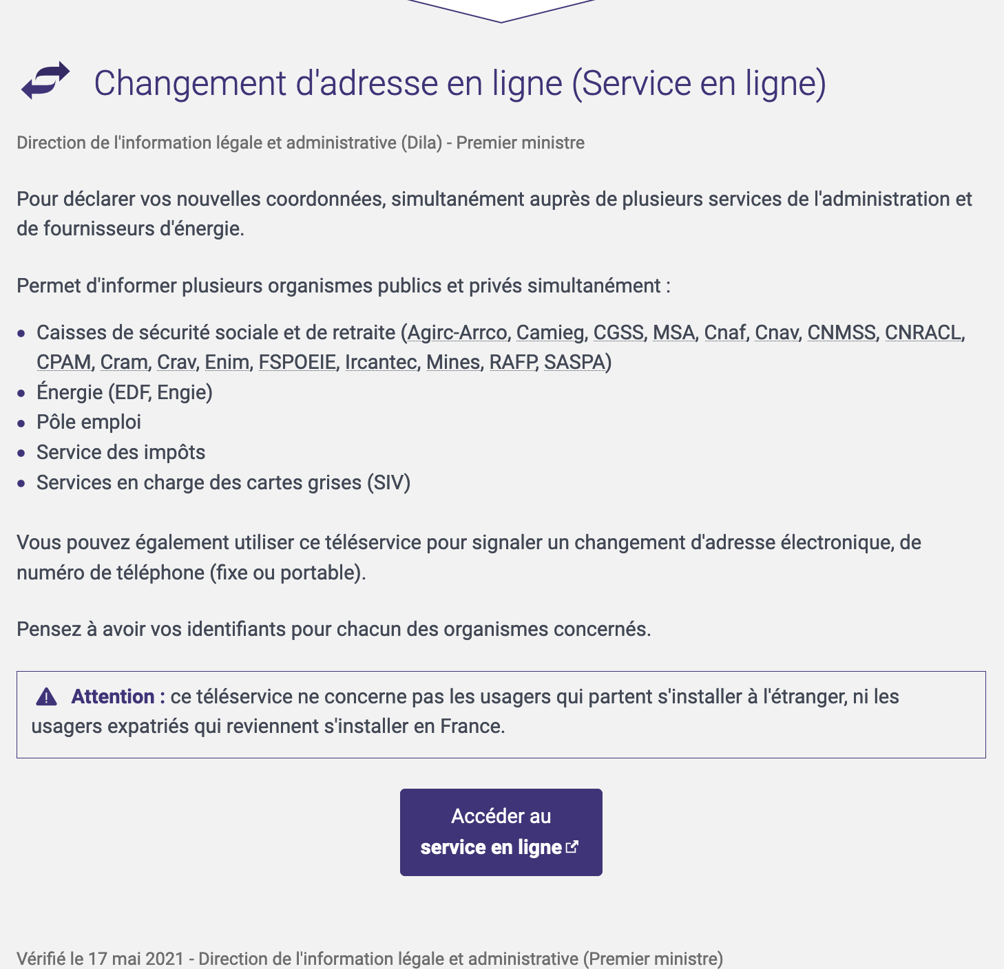 Le site officiel www.service-public.fr permet aux administrés de communiquer gratuitement leur changement de coordonnées aux principaux organismes publics et privés à partir de la page « Changement d’adresse en ligne ».