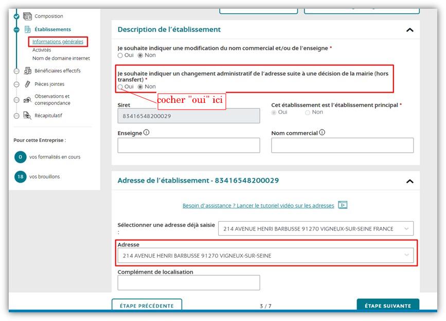3/ Dans les informations générales de l’établissement, une case à cocher, dans le cadre « Description de l’établissement », permet d’indiquer que l’adresse a été modifiée administrativement suite à une décision de la mairie, ce qui n’engendre pas de frais. L’adresse modifiée peut enfin être saisie dans le cadre « Adresse de l’établissement » .