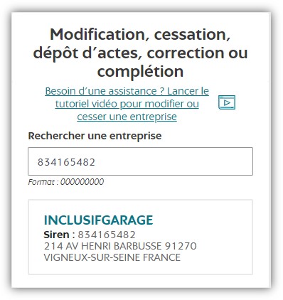 1/ effectuer une formalité de modification à partir du n° SIREN de l’entreprise :