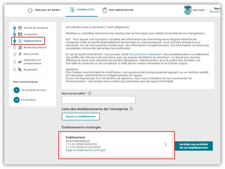 2/ dans l’étape « Établissements » de la formalité, il convient de cliquer sur l’établissement impacté par la modification d’adresse