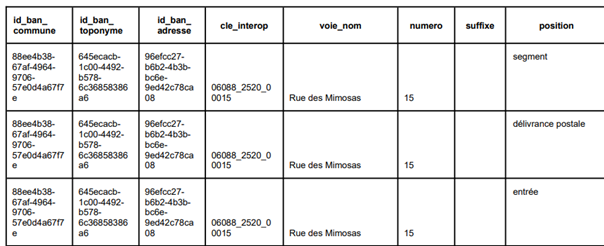 · id_ban_adresse : c’est l’identifiant de l’adresse. Il est le même pour toutes les positions de l’adresse (pour ceux qui souhaitent gérer plusieurs positions).