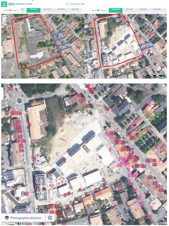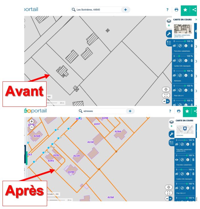 b. Cas de renouvellement urbain m/n (cf. illustrations en annexe) avec réorganisation de l’espace et des lieux) avec probablement la conservation de certaines des expressions littérales de l’adresse existantes. Dans ce cas il est préconisé de supprimer les points adresse existants et donc identifiants différents avec les nouveaux points crées...