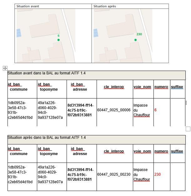 Cas d’une modification de numéro (passage du classique au métrique) : le 6 Impasse du Chauffour devient le 230 Impasse du Chaufour. L’uuid de l’adresse id_ban_adresse n’a pas changé, seule la valeur de la colonne numéro change (ainsi que la colonne cle_interop par ricochet).