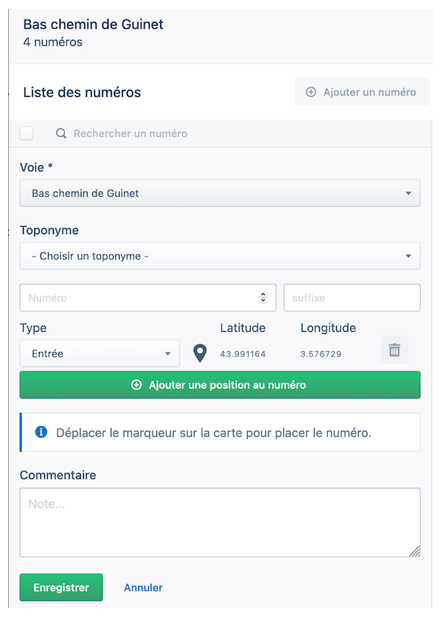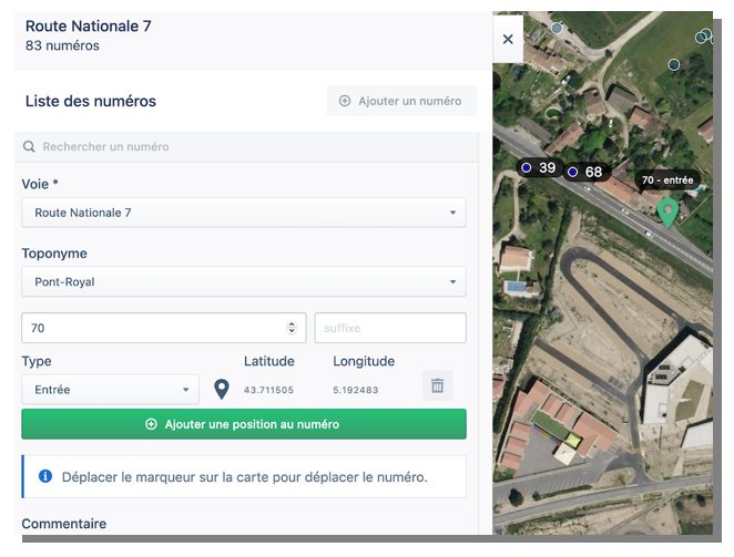 Le commentaire est un outil de travail à utiliser par exemple en cas de doute sur la position d’un numéro. Le commentaire n’est pas exporté dans la Base Adresse Nationale.
