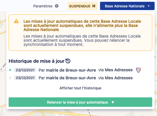 Une Base Adresse Locale est suspendue lorsque l’utilisateur décide de mettre en pause temporairement les mises à jour de sa base Adresse Locale dans la Base Adresse Nationale.